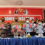 LABUHANBATU- Kapolres Labuhanbatu AKBP Deni Kurniawan pimpin konferensi pers pengungkapan kasus pembakaran Rumah Dinas (Rumdis) Kepala Lembaga Pemasyarakatan (Kalapas) Kelas III Kota Pinang, di ruang lobi Polsek Kota Pinang, Senin (2/8/2021).