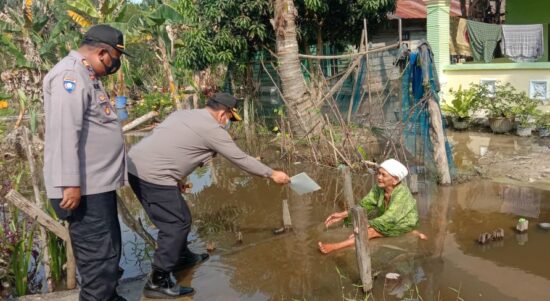 BATUBARA-Kunjungi masyarakat terdampak banjir, Kapolres Batubara AKBP Ikhwan Lubis SH MH memberi bantuan kepada warga Desa Air Hitam Kecamatan Datuk Limapuluh, Senin (7/12/2020 ).