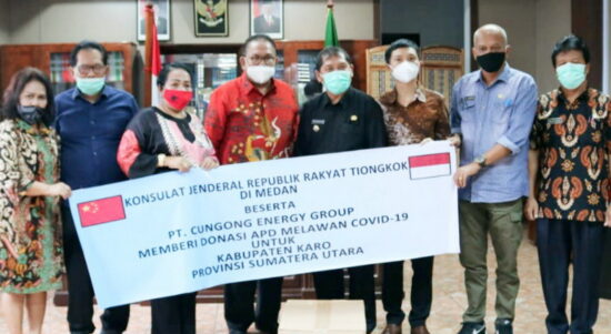 KARO – Konjen RRT (Konsulat Jenderal Republik Rakyat Tiongkok) di Medan beserta PT. Cungcong Energy Group memberikan bantuan masker kepada Pemerintah Kabupaten