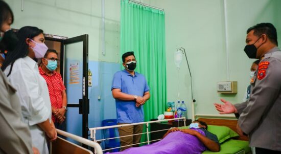 MEDAN – Wali Kota Medan Muhammad Bobby Afif Nasution dan Kahiyang Ayu menjenguk Julianus Simanungkalit di Rumah Sakit Bhayangkara Jalan Wahid Hasyim Medan