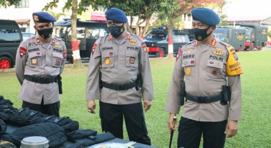 MEDAN – Komandan Satuan Dansat Brimob Polda Sumut, Kombes Pol Suheru, mengecek pasukan dan peralatan personel. Kegiatan itu dilakukan dalam apel kesiapsiagaan