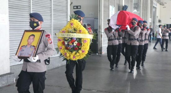 MEDAN – Satuan Brimob Polda Sumut melakukan acara penyambutan terhadap jenazah Bharatu Anumerta Muhammad Kurniadi Sutio, Senin (27/9/2021). Kegiatan itu dipimpin langsung