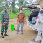ACEH SINGKIL – UPTD Puskesmas bersama unsur Koramil Kecamatan Gunung Meriah Kabupaten Aceh Singkil melakukan penyemprotan desinfectan di salah satu rumah pasien