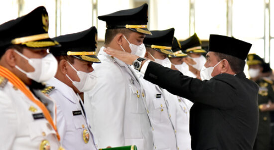 MEDAN – Gubernur Sumatera Utara (Sumut) Edy Rahmayadi melantik enam kepala daerah masa jabatan 2021-2024 di Aula Tengku Rizal Nurdin, Rumah Dinas