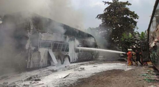 Bus Sinar Jaya, satu satu armada AKAP (Antarkota Antarprovinsi) trayek Jakarta-Wonogiri terbakar saat sedang melaju di KM 15 Tol Jagorawi, Selasa (27/10/2020)