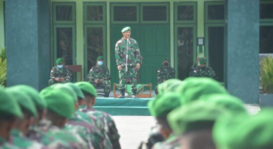 JAYAPURA-Komandan Korem 172/PWY Brigjen TNI Izak Pangemanan Selaku Dankolakops memberikan pengarahan kepada personel Satuan Tugas Pengamanan Perbatasan (Satgas Pamtas) RI-PNG Yonif 126/KC