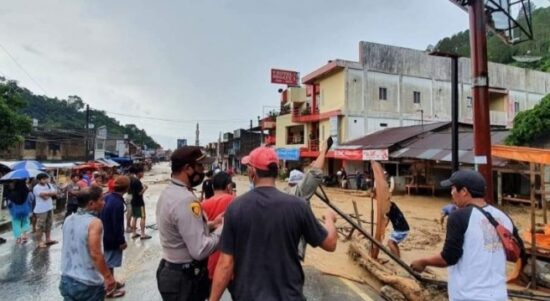 Simalungun – Masyarakat kota wisata Parapat, Kabupaten Simalungun, Sumatera Utara, bersama petugas gabungan TNI-Polri harus bergotong royong membersihkan material banjir. Akibat