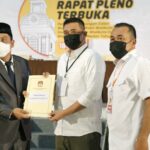 MEDAN – Ketua KPU Kota Medan Agussyah Damanik (kiri) menyerahkan berkas surat hasil Rapat Pleno Terbuka Penetapan Pasangan Calon Wali Kota dan