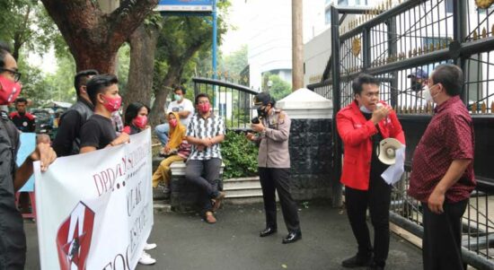 MEDAN – Puluhan massa yang mengatasnamakan DPD Gerakan Mahasiswa Nasional Indonesia (GMNI) Sumut menggelar aksi unjukrasa di gedung DPRD Sumut, Kamis (1/10/2020).