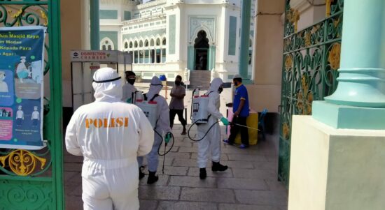 MEDAN – KBR Detasemen Gegana Satbrimob Polda Sumut melakukan penyemprotan disinfektan di Mesjid Raya Al Mashun Medan, Rabu (10/3/21). Itu dilakukan sebagai
