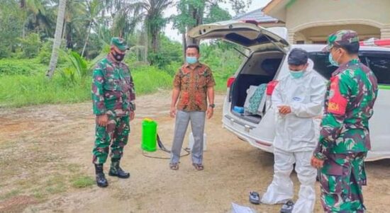 ACEH SINGKIL – UPTD Puskesmas bersama unsur Koramil Kecamatan Gunung Meriah Kabupaten Aceh Singkil melakukan penyemprotan desinfectan di salah satu rumah pasien