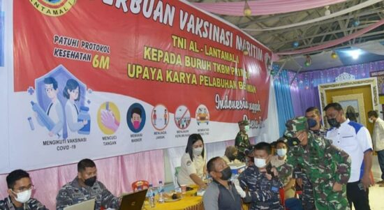 MEDAN – Petugas Lantamal I/ Belawan melaksanakan vaksinasi terhadap 500 anggota Tenaga Kerja Bongkar Muat (TKBM) Primer Koperasi Upaya Karya Pelabuhan Belawan