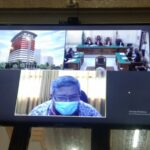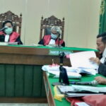 MEDAN – Majelis Hakim PN Medan dengan ketua, Merry Donna Tiur Pasaribu, dalam persidangan secara daring di Ruang Sidang Cakra 4, Senin