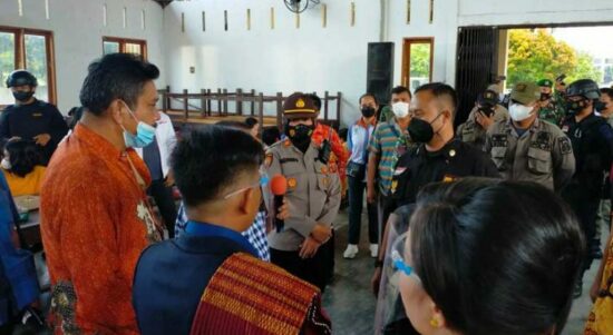 MEDAN – Polsek Patumbaktim Gugus Tugas Covid-19, membubarkan pesta pernikahan di Aula Gereja HKBP Resort Martoba I Jalan SM Raja Km 10,