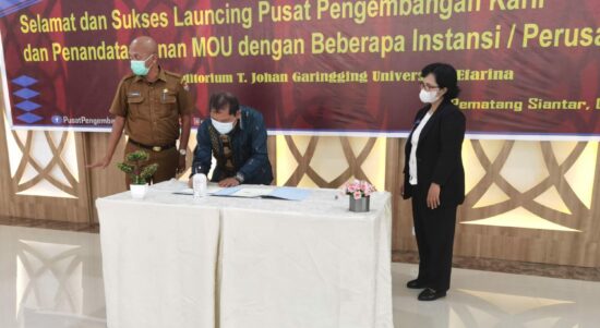 SIMALUNGUN – Bupati Karo Terkelin Brahmana SH MH dan Rektor Unefa (Universitas Efarina) Dr Sondang Sidabutar SKM MKes menandatangani MoU (Memorandum of