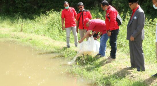 TAPANULI UTARA – Bupati Tapanuli Utara Drs. Nikson Nababan, M.Si didampingi beberapa Pimpinan OPD dan Camat Tarutung tabur benih ikan dan tanam