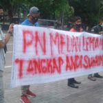 MEDAN – Sekira belasan massa demonstran mengaku dari Gerakan Rakyat Anti Diskriminasi (Garansi) ‘menggeruduk’ gedung Pengadilan Tipikor Medan, Kamis (3/9/2020). Massa mendesak