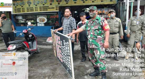 MEDAN-Tim gabungan Kecamatan Medan Marelan menyikat papan reklame tak berizin di sepanjang Jalan Marelan Raya, Jumat (10/6/2022). Tim dipimpin Camat Medan Marelan