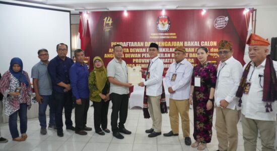 MEDAN-Partai Gerindra Sumatera Utara mendaftarkan bacaleg mereka untuk DPRD Sumut, Sabtu (13/5/2023). Suasana gembira dan ucapan syukur pun langsung terasa saat Ketua